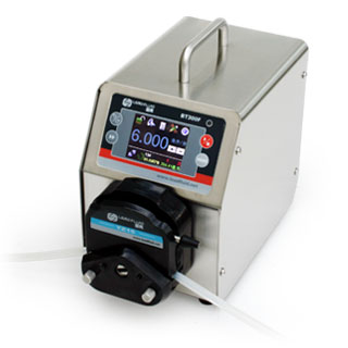 BT300F分配型智能蠕动泵流量范围0.006~1600毫升/分钟。采用彩色液晶和触摸屏技术,操作界面简单,直观,明了。主要适用于各种复杂的液体定量分配,适用于精确计量和定量给料,可以实现高精度的流量传输控制。对液量分装精度要求高时,使用液量分配模式更加方便;对产量要求高时,使用时间分配模式更加方便;需要将一定液体分装为若干份液体时请使用复制分配模式。设置为流量模式时,完全等同于一台流量型蠕动泵。为了减小不必要的风扇噪音,采用了智能温控技术。在RS485通讯中,因为采用了MODBUS协议,更易于与其他控制设备如计算机,人机界面,PLC等连接。
